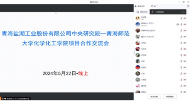 5月22日,公司与青海盐湖工业股份有限公司中央研究院召开线上项目合作交流会。青海盐湖工业股份有限公司副总裁马黎春、中央研究院经理何永平、副经理严雄仲、成都分院牛慧莉、各产业中心负责人应邀出席会议。公司科技处副处长谢惠春及相关科研人员参加了会议交流,会议由公司副经理许乃才主持。