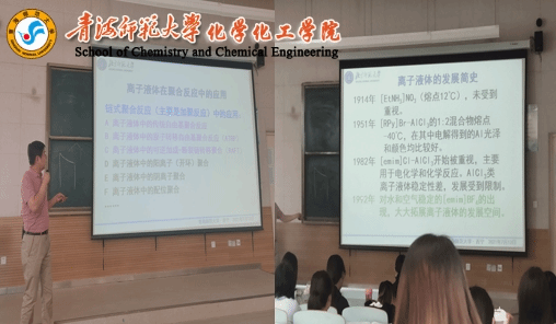 刘教授主要讲授了高分子材料的诞生及离子液体的发展史相关内容,围绕高分子材料开展讲述。刘教授讲到塑料分类、高性能聚合物、工程塑料、通用塑料等一系列的优缺点。刘教授更是声情并茂地讲述了室温离子液体,通过其发展简史由浅入深,娓娓道来,激发了化学领域中的浓烈兴趣,使同学们深受启发!