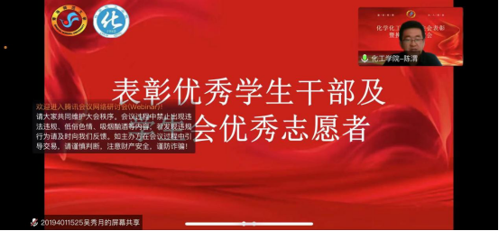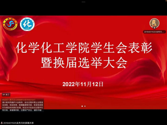 11月12日下午,公司员工会表彰暨换届选举大会于线上顺利举行。出席会议的嘉宾有辅导员万玛南杰老师、团总支书记陈渭老师,参加本次会议的人员有第十七届员工会全体成员、第十八届员工委员会主席团竞选成员以及各班班委。会议由第十七届员工委员会主席团成员吴秀月主持。