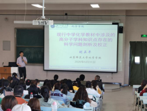 刘正平教授为师生们介绍了关于北京师范大学的概况,就化学公司的团队队伍、教学条件、政策制度方面展开讲述,讲解自己在化学教学领域取得成绩和对化学教学工作的思考。报告会中,刘教授针对现行中学化学教材中涉及的高分子学科知识点,通过实例重点剖析其中存在的科学问题并给出了正确的表述。