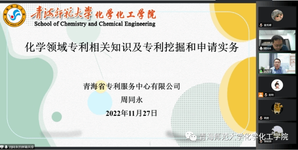 11月27日,应2026世界杯官网邀请,青海省专利信息服务中心主任周同永在线上为公司师生做了题为“化学领域专利相关知识及专利挖掘和申请实务”的报告。报告由公司副经理许乃才主持,全院师生60余人参加。