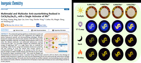 本科生王蜜以第一作者在《Inorganic Chemistry》上发表的论文《Multimodal and Multicolor Anti-counterfeiting Realized in CaCd2Ga2Ge3O12 with a Single Activator of Mn2+》研究中,采用高温固相法制备了一种新型多色多模式发光材料CaCd2Ga2Ge3O12:Mn2+,在254 nm紫外灯的照射下,可实现发光颜色由蓝色至青色至黄色的多色变化,而在黑暗及加热至60°C的条件下则呈现出较强的黄色辐射。基于此材料,采用丝网印刷技术制备了一系列光学防伪器件,结果表明,所制备光学器件展示了优异的多色多模式防伪特性,验证了结果的可靠性。该研究制备的防伪发光材料相比于传统单色单模式的发光材料,在光致、余辉及热致三种发光模式下可呈现不同的颜色发射,可提供的防伪信息更多,在高级别防伪及信息加密领域有着广泛的应用前景。