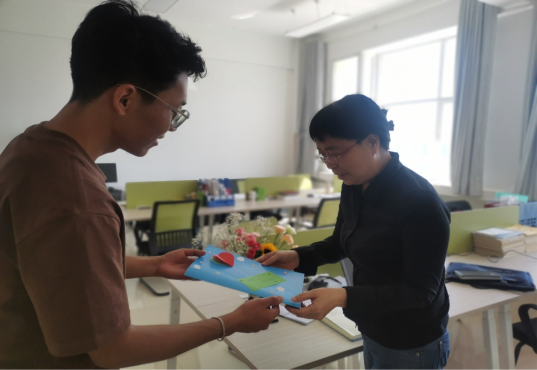 素纸书笺,尽写真言。前期准备工作中,各部门负责人带领部员制作教师节贺卡,在精美的贺卡上书写句句祝福,字里行间流露出对老师的感激之情。公司每位收到祝福的老师都深受感动,向同学们表达了内心的谢意,并与同学们亲密交谈,展现出浓浓的师生情。