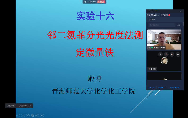 首先,分析化学教研组全体成员认真听取了公司殷博老师讲授的分析化学实验《邻二氮菲分光光度法测定微量铁》实验课程,殷老师采用超星课堂进行线上教学,课堂内容准备充分,授课重难点突出,对实验过程中容易出现的问题作了详细地讲解。教学过程中,殷老师利用超星课堂多种功能,结合实验视频资源,给员工讲授了一堂生动的实验课。